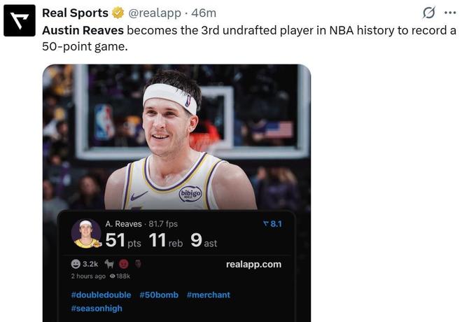 值得一提的是,在前一場比賽東契奇因為罰球不中錯失50分時,里夫斯還在賽后社媒留言“嫌棄”東契奇錯失50+得分,結(jié)果在東契奇缺席的首場比賽中,里夫斯就自己轟下51分。